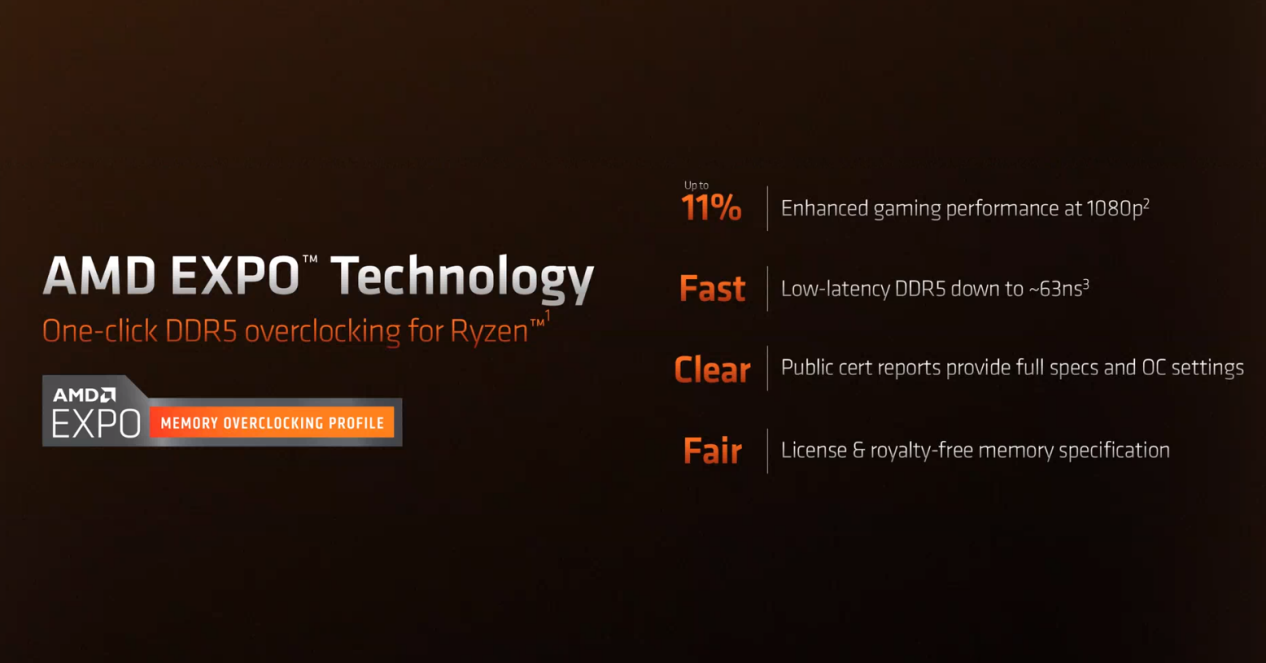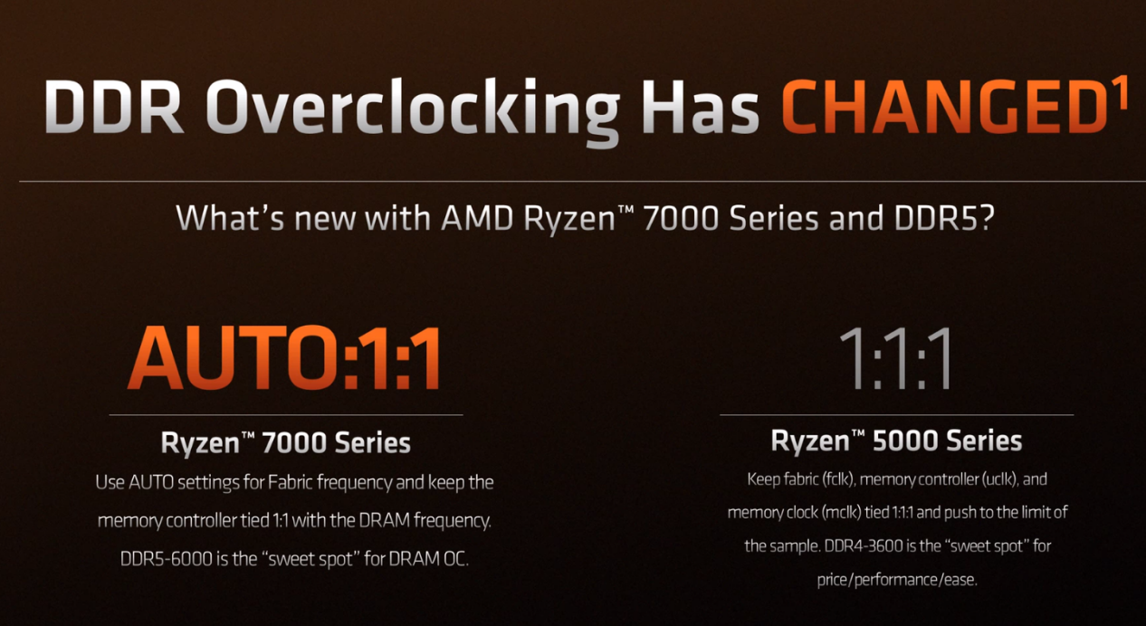 锐龙7000全线只能搭配采用AM5接口的600系主板使用,内存只兼容DDR5,支持AMD专为DDR5内存“一键超频”推出的EXPO技术,大幅提升内存频率、降低内存延迟,从而获得更佳的游戏体验。而且AMD官方表示使用DDR5 6000时(Fabric总线频率设置为自动),锐龙7000的内存控制器频率与内存频率正好是1比1,此时拥有最佳的延迟表现,所以DDR5 6000就是锐龙7000的“甜点”内存设置。