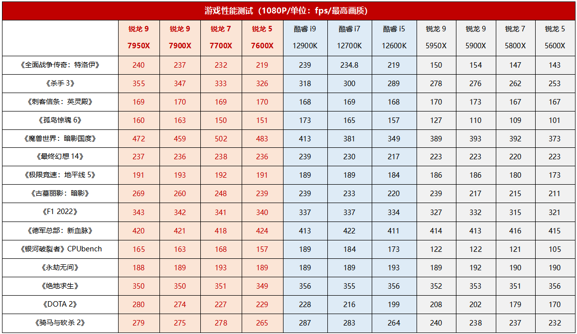 综合来看,Zen4架构的锐龙7000的游戏性能相比Zen3架构的锐龙5000强了一大截,特别是之前锐龙5000比较弱势的几款游戏,都有了长足的进步。锐龙9 7950X虽说没能在所有测试中胜过酷睿i9 12900K,但也做到了优势游戏大幅领先、弱势游戏相对差距缩小,综合表现还是令人满意的。