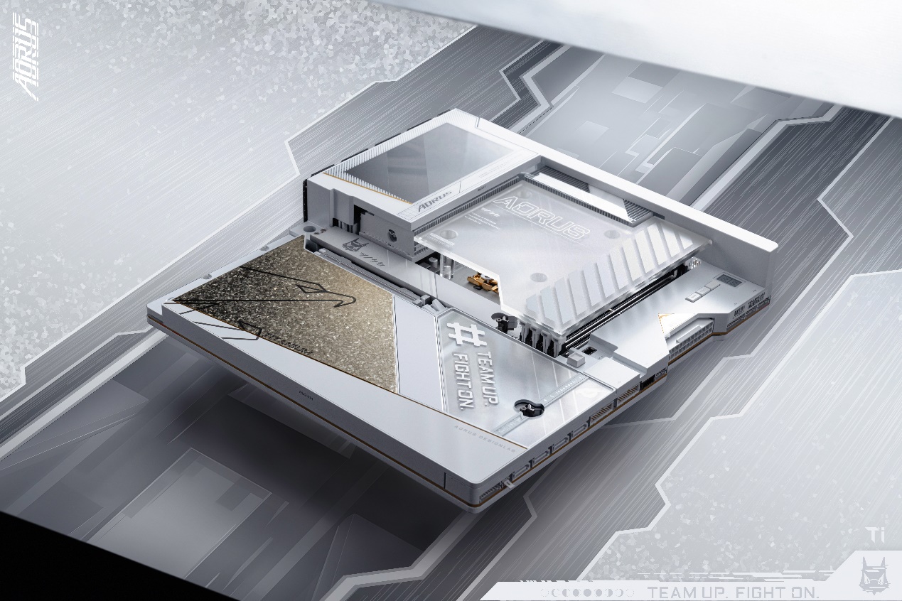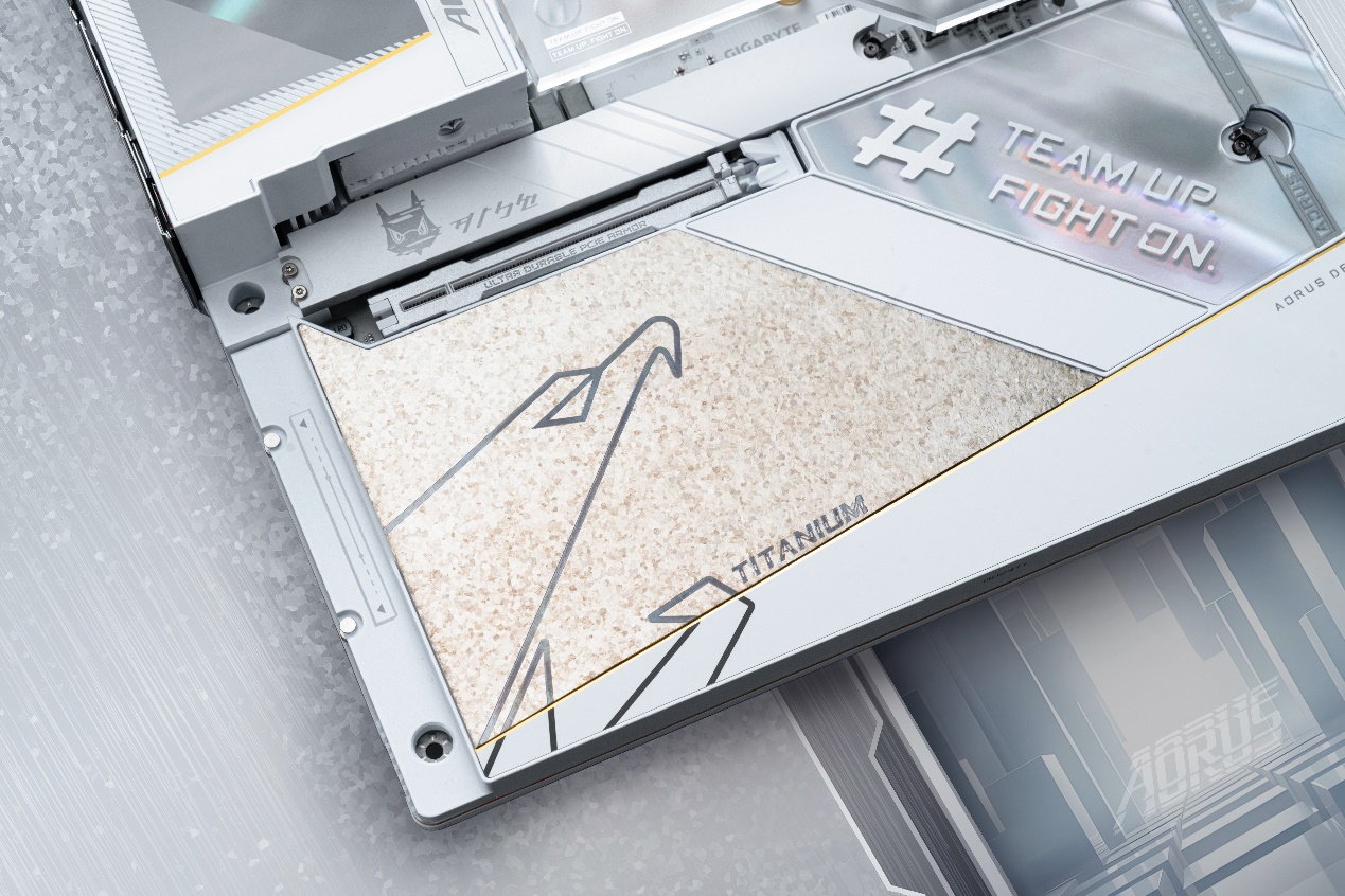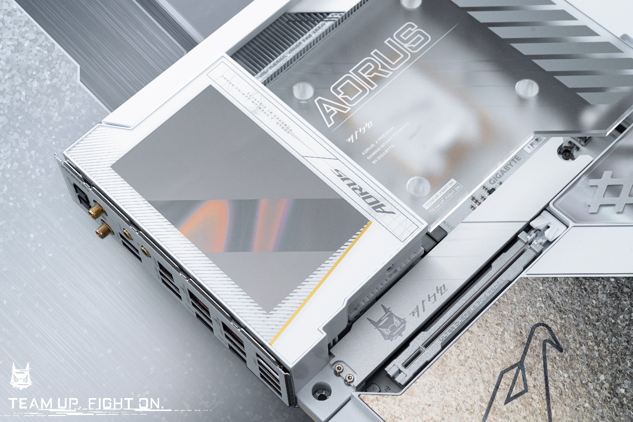 在“钛冰花”纹理旁,设计有AORUS的口号“TEAM UP FIGHT ON”,流光溢彩的背景纹理,在不同角度下呈现出不同的色彩,结合色彩和细节,每个角度都反映了不同的色彩故事。传统银白色、金色与更富有科技感的炫彩相碰撞,带来了艺术气质上的升华。