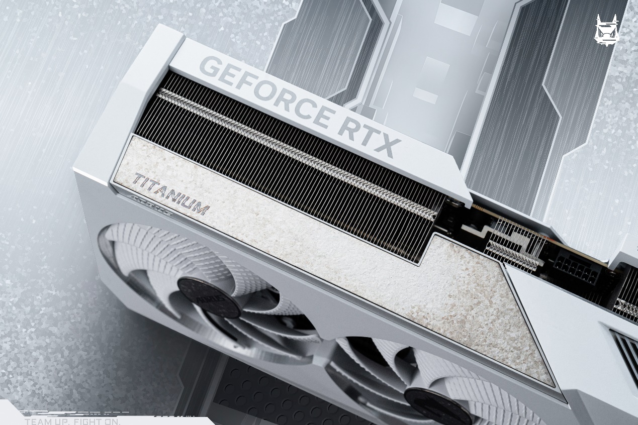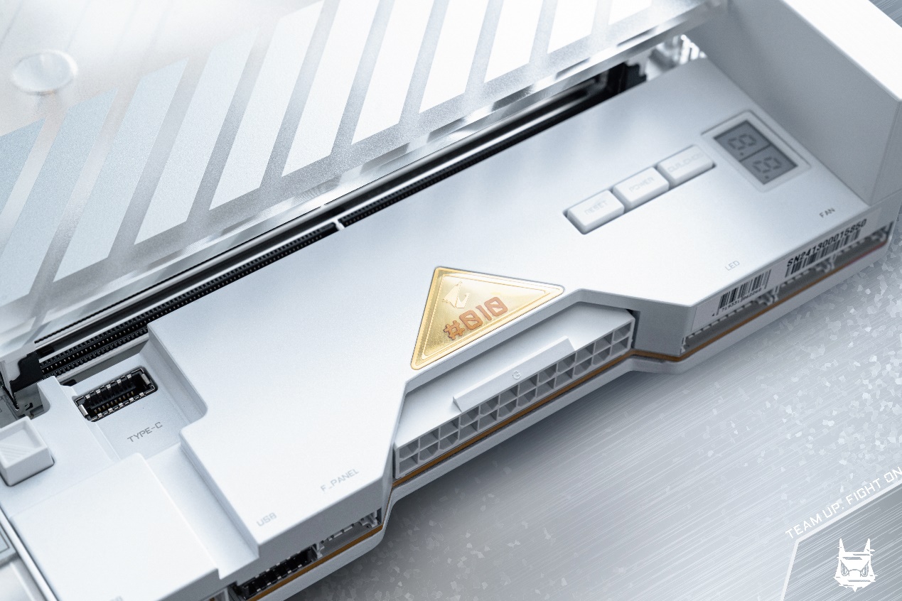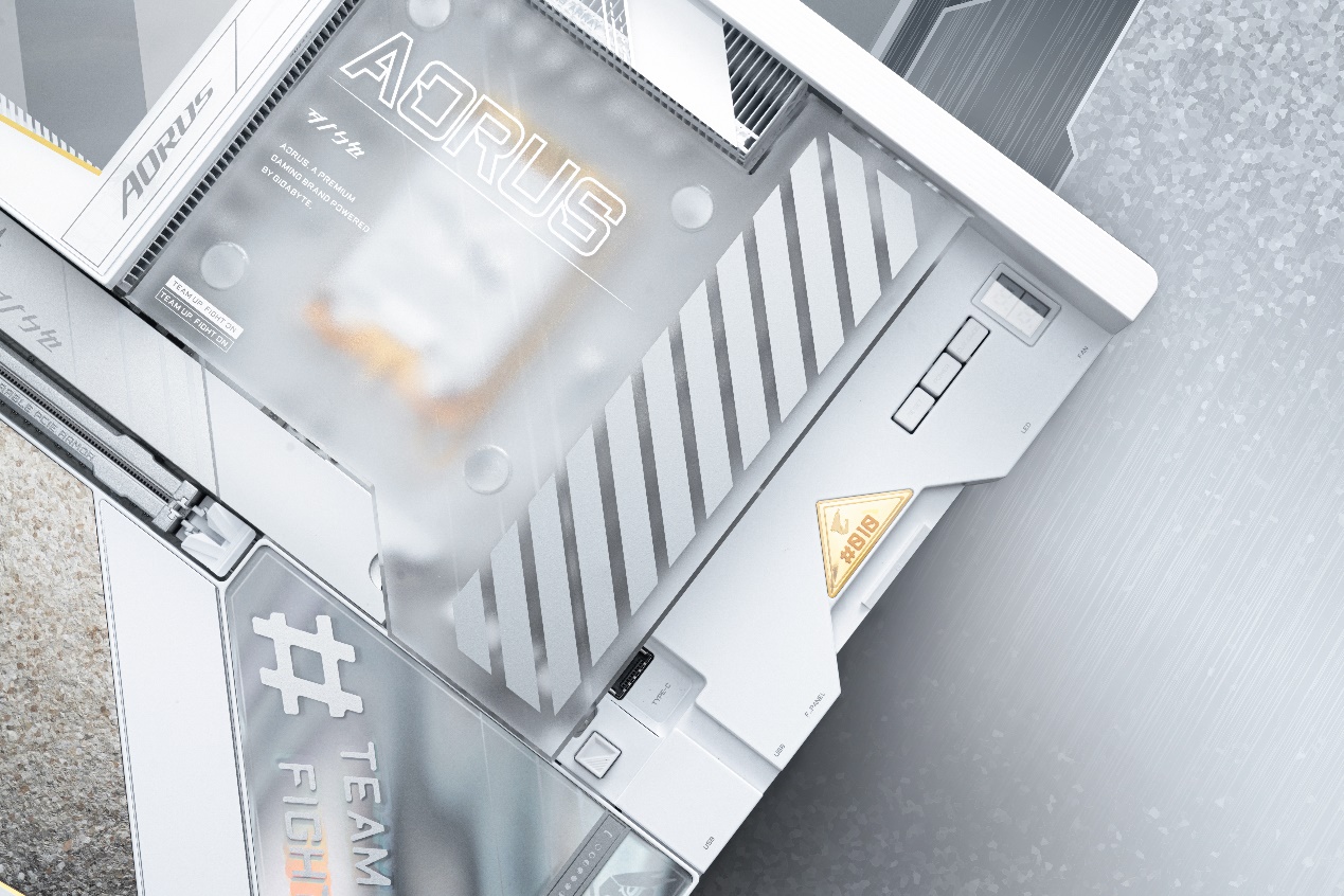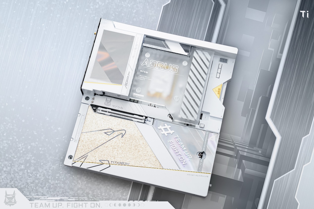 在“钛冰花”纹理旁,设计有AORUS的口号“TEAM UP FIGHT ON”,流光溢彩的背景纹理,在不同角度下呈现出不同的色彩,结合色彩和细节,每个角度都反映了不同的色彩故事。传统银白色、金色与更富有科技感的炫彩相碰撞,带来了艺术气质上的升华。