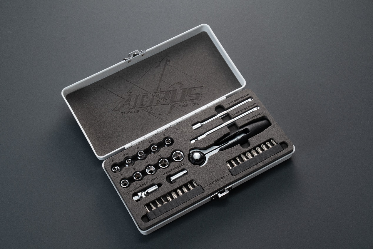 除了常规的主板附件,包装内还附送了一套精致的装机工具箱,它采用了和主板相同的设计美学,而精致的机械工具,也能让每一个玩家欲罢不能。