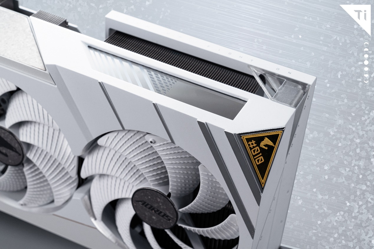 AORUS GeForce RTX 4080 SUPER XTREME ICE 16G钛金雕显卡本体采用了和主板一致的美学设计,搭配起来有浑然一体的视觉感受。和主板一样,显卡上最耀眼的设计也是右上角的限定版金属铭牌。它同样采用黄金打造,刻有AORUS LOGO与三位数编号,是钛金雕系列限定显卡的专属标志。