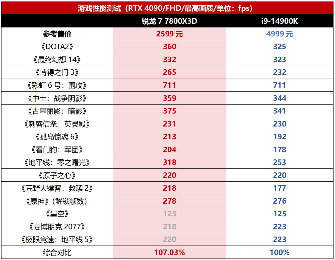 我们还注意到,在提供顶级游戏性能的同时,锐龙7 7800X3D的游戏功耗还不到70W,i9-14900K甚至要高出100W,两者在能效比方面的表现差距明显。这直接影响到与CPU搭配的主板、散热器以及电源的档次,再加上两者高达2400元的价格,可以说在性价比上锐龙7 7800X3D远远地将i9-14900K甩在了身后,这才是当前最值得购买的顶级游戏处理器。