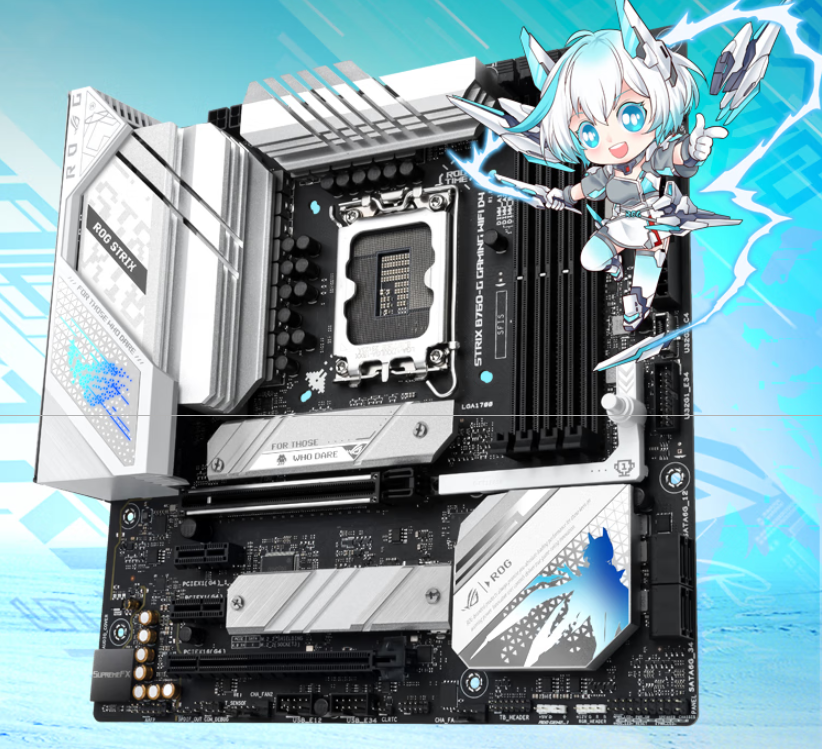 在B760主板发布之后,华硕第一时间就推出了ROG STRIX B760-G GAMING WIFI D4小吹雪(简称ROG B760小吹雪D4)。这款产品通过银白战甲、赛博朋克元素以及ROG电竞图腾等元素打造出的高颜值外观,是吹雪系列主板的标志性卖点。在最新的ROG B760小吹雪D4吹雪主板上,华硕对其进行了升级,打造出了更美观、更具辨识度的外观。