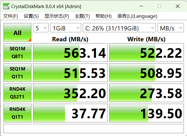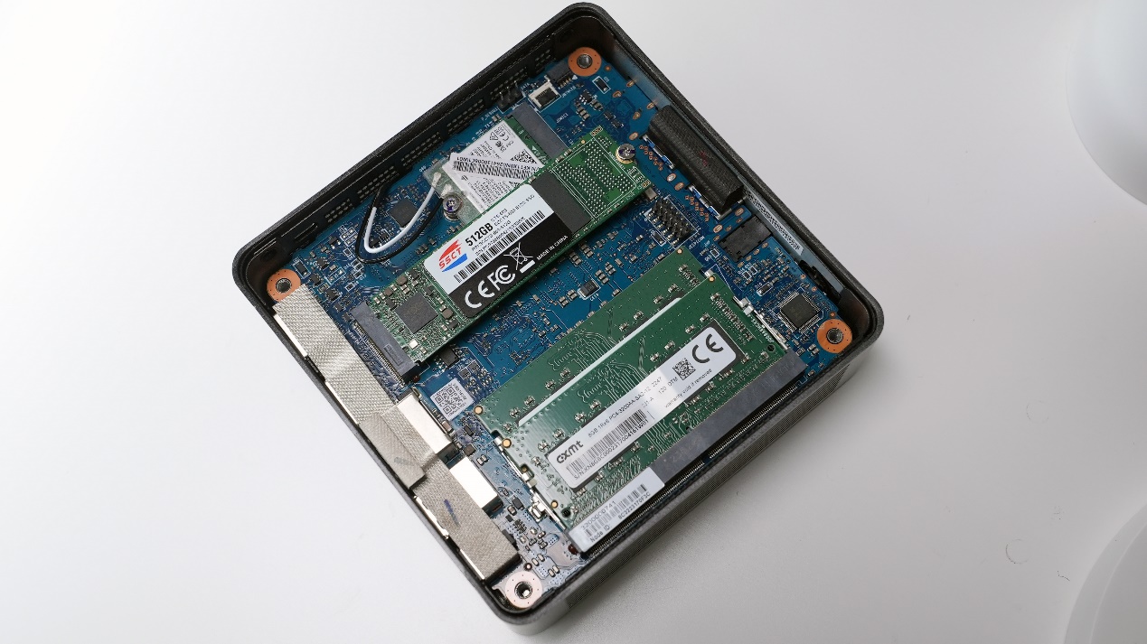 另外,宏碁非凡Go在内存和硬盘空间上具备了足够的扩展性。拆机后可以看到宏碁非凡Go拥有两个内存插槽和一个2280全尺寸M.2接口。它最高支持2×32GB DDR4 3200MHz双通道内存。硬盘官方宣称最高支持1TB存储容量。,2280 M.2硬盘接口,用户后期可自行扩容更高容量的SSD也很便利。实测自带固态硬盘的基准读写性能可以满足基本办公性能需求, CrystalDiskMark8最高顺序读取速度为563MB/s,最高顺序写入速度为522MB/s。