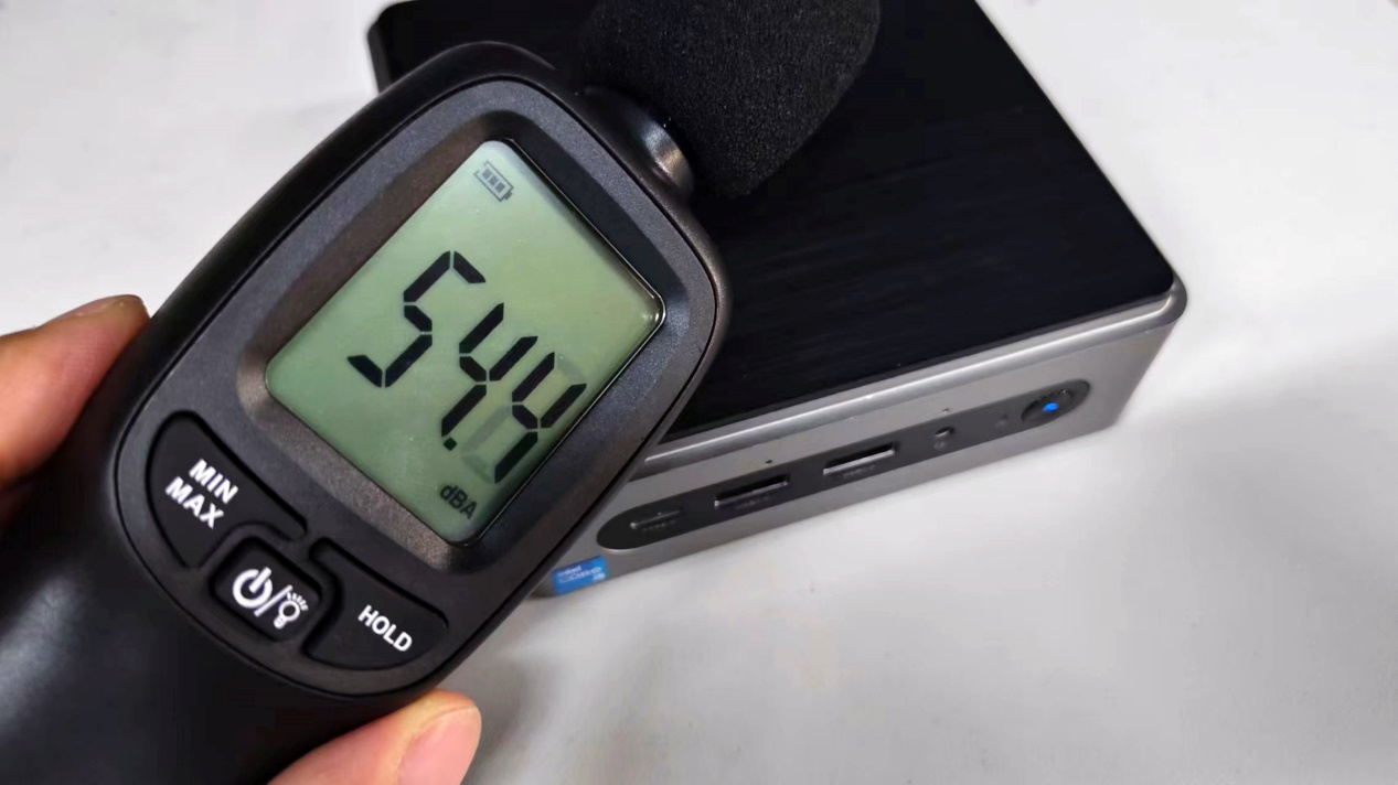 而在在维持高负载的考机过程中,宏碁非凡Go迷你主机依然保持了足够安静的运行状态,机身表面噪音仅为54.4dB(由于测试环境限制,噪音数值为分贝仪紧贴机身得出的,实际环境下人耳几乎感受不到来自机身风扇的噪音)。半小时考机测试后,宏碁非凡Go机身表面平均温度为45℃左右,机身表面最高温度为50.8℃,在出风口附近。