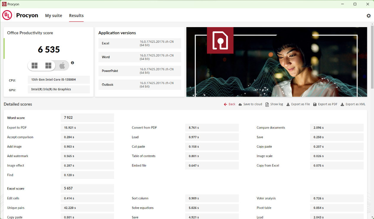 作为一台强调安静办公的机型,我们原本对它实际使用场景下的表现没抱过高期望。但在一系列实际应用测试之后,我们发现宏碁非凡Go的实际应用表现远超我们的预期!其PCMark 10现代办公性能最终得分为5953。这一成绩和目前同样强调主打低功耗的P系列主流轻薄本相去不远(酷睿i7 1360P的PCM10现代办公成绩大约在6100~6250这个区间)。Procyon办公基准测试得分为6535。值得一提的是,从办公基准测试来看,宏碁非凡Go的应用开启响应速度非常快。同步开启8个带动图的100MB的Word文件以及160MB的PPT大文件,在这款机型上操作非常迅速且流畅。