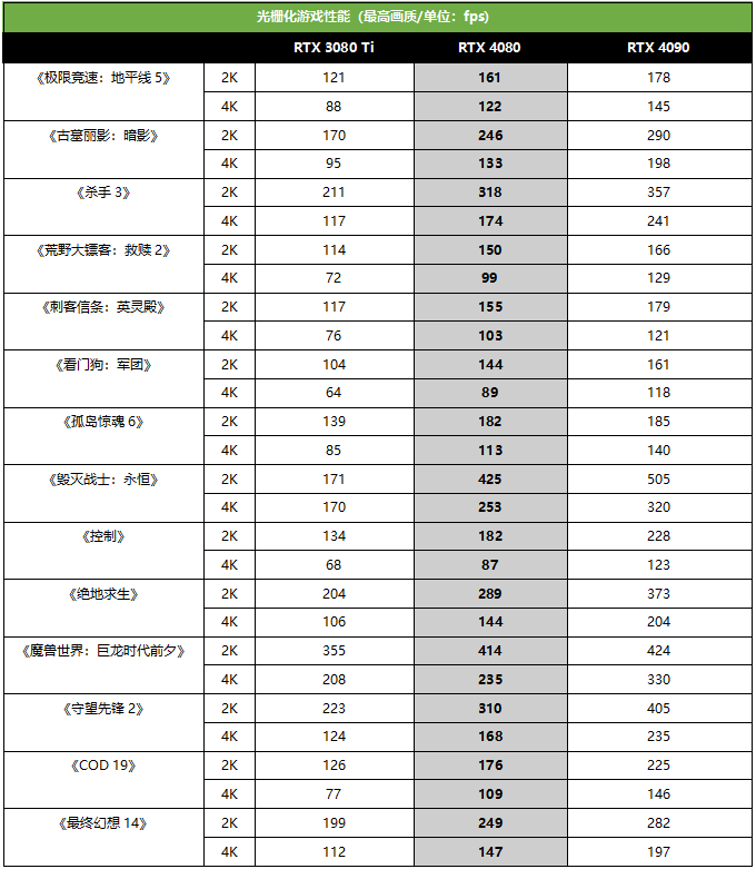 在传统光栅化游戏部分,我们先看2K分辨率下,RTX 4080的成绩全面领先于RTX 3080Ti。而且细看成绩的话,可以发现就算是游戏帧速成绩最低《看门狗2:军团》中,平均帧速也达到了144fps,可以带来相当流畅的游戏视觉体验。由此看出,2K分辨率游戏对于显卡性能的要求太低了,GPU受制于处理器等子系统的限制根本无法全力施展。因此我们来看看4K分辨率下的情况。