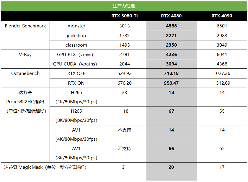 ●12GB显存及以上型号提供双NVIDIA编码器(NVENC),可最多缩短一半的视频导出时间,并提供了对AV1的硬件编码支持。