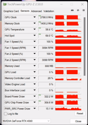 华硕TUF-RTX4080-O16G-GAMING搭载了强悍的3风扇3.65槽散热系统,可以保证显卡稳定释放性能。GPU默认游戏频率2625 MHz,在运行《3DMark》TimeSPY场景时,华硕TUF-RTX4080-O16G-GAMING的最高频率达到了2790MHz,此时显卡的整板功耗为322.2W。FurMark烤机测试中,华硕TUF-RTX4080-O16G-GAMING的GPU温度最高56.8℃,结温50℃,默认考机功率最高319.4 W,散热表现十分惊人。