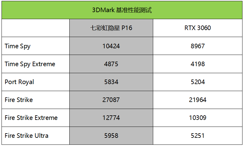 在DX12测试Time Spy场景中,隐星P16的跑分是10424,符合普遍的满功耗RTX 4060的跑分水平,看来该机的显卡性能是满血发挥,同时领先RTX 3060约16%。在DX 11测试Fire Strike Extreme中,隐星P16的跑分是12774,领先RTX 3060约24%。总的来说,就基准性能测试而言,大家可以放心了,极致性价并没有在性能方面带来缩水!