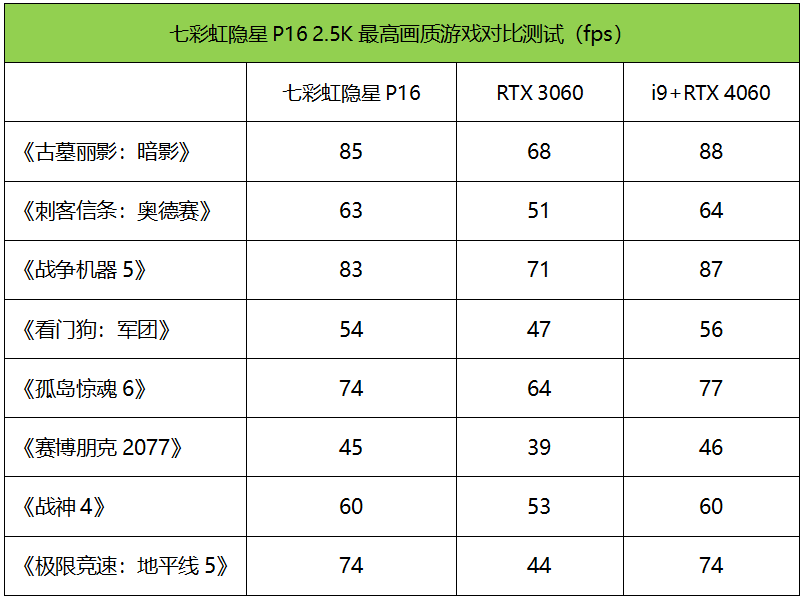 ●而对比i9 13980HX+RTX 4060机型,在2.5K最高画质下,七彩虹隐星P16和它的帧速几乎保持一致,换句话说,对于RTX 4060,大家所担心的i7 12650H够用吗?——完全没问题,且不影响RTX 4060的性能发挥,玩游戏性价比更高,就算提升到顶级的移动处理器,对于3A游戏的画面帧速也几乎无影响。