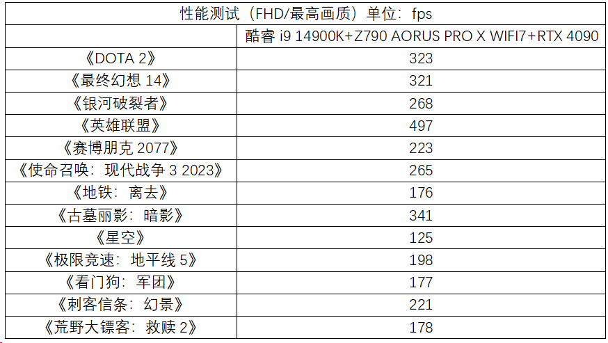在大家最关心的游戏性能方面,我们选择了十几款热门游戏进行测试。综合款游戏的帧率表现来看,技嘉Z790 AORUS PRO X WIFI7主板搭配酷睿i9 14900K和RTX 4090 顶级游戏平台的表现同样出色,不论是电竞网游还是3A游戏大作的帧率都表现都十分出色,充分发挥了旗舰处理器和显卡的性能,可以为玩家带来非常流畅的游戏体验。