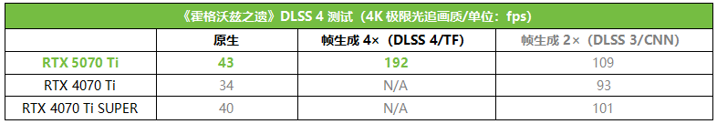 《霍格沃兹之遗》4K极限光追设置下,RTX 5070 Ti开启DLSS 4+4×多帧生成帧率可达192fps,相对原生下提升了347%之多,相对游戏自带的DLSS 3+帧生成模式也提升了76%,相对RTX 4070 Ti和RTX 4070 Ti SUPER的原生帧率更是分别提升了465%和380%,相对它们开DLSS 3帧生成大约提升了一倍。