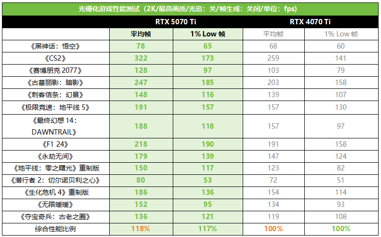 1% LOW帧部分,由于RTX 5070 Ti拥有更大的显存和更高的显存带宽,因此在流畅度方面也更有优势,综合全部游戏来看,领先了RTX 4070 Ti大约17%。