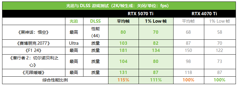在仅开启光追和DLSS超分辨率的2K游戏中,RTX 5070 Ti相对RTX 4070 Ti的平均帧提升幅度大约为15%。基本符合芯片规模的提升幅度。当然,未来的游戏大作基本上都会支持DLSS 4和多帧生成,这样一来RTX 5070 Ti在实战中的优势只会越来越大。
