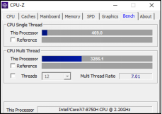 ▲CPU-Z的基准性能测试,单核469,多核3286。这个数据大家可能有些陌生,对比一下第七代酷睿的成绩就很清晰了▼。