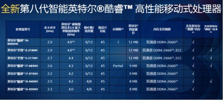 ▲简单说,移动标准电压处理器分为两大类别:第一是针对移动工作站的移动至强处理器,这里不详细说了;和普通用户密切相关的是第二类——第八代的酷睿i5/i7移动处理器,以及全新的酷睿i9移动处理器。