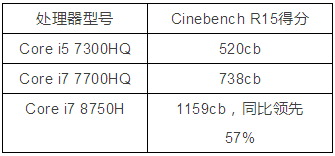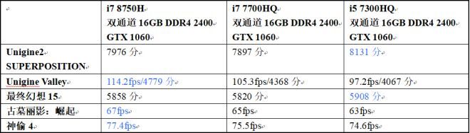 这里会发现两个有趣的结果,Unigine2 Superposition测试和最终幻想15的测试项目上,i5 7300HQ的成绩竟然超过了i7 7700HQ和i7 8750H。且不说第八代和第七代的对比,我们就单说第七代酷睿的i5和i7对比,i5 7300HQ无论是线程数量还是频率,都低于i7 7700HQ,所以这样的成绩只能说是“这款i5笔记本的GTX 1060独显的性能的确调教得更出色或者说激进”。