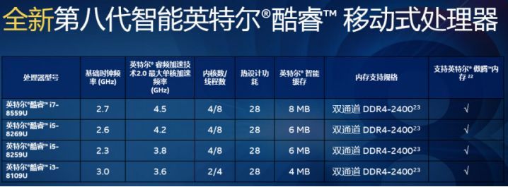 ▲这个部分可能稍微懂行点的读者才看得懂——英特尔的酷睿U系列处理器其实是有两个大类的,一类就是我们常见的15W TDP的,它是最主流的,主要用于家用轻薄本、轻便本、常规的商用笔记本。而第二类酷睿U系列是28W TDP的,型号方面以9结尾,比如i5 8259U、i7 8559U。它们的TDP之所以高出不少,是因为它们搭载的集成显卡是“锐炬”系列,性能比一般的HD620、HD630什么的要高很多。不过由于种种原因,这个系列在市场中并不常见,这是后话,这里不阐述了。