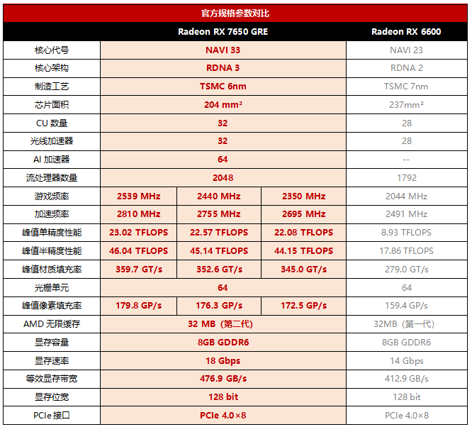 当然,既然是“6”字辈,RX 7650 GRE准确来说算是RX 6600的升级版。从7nm NAVI 23升级到6nm NAVI 33,RX 7650 GRE芯片面积相对RX 6600缩小了14%,但晶体管数量增加了20%,从而增加了14%的CU单元。同时,因为架构的升级,RX 7650 GRE的单精度、半精度算力相对RX 6600都有最多158%的巨幅提升,这对于AI用户来讲是很重要的特性。显存部分,RX 7650 GRE和RX 6600一样都是配备的128bit/8GB GDDR6显存,但速率提升到了18Gbps,同时RX 7650 GRE配备的32MB无限缓存升级到了第二代,因此它的等效显存带宽相对RX 6600提升了16%。PCIe部分,RX 7650 GRE和RX 7600/6600一样都是PCIe 4.0×8的规格,对于主流1080P游戏显卡来说其实完全够用,显卡插槽节约出来的8条PCIe通道在一些主板上还可以分配给SSD使用。