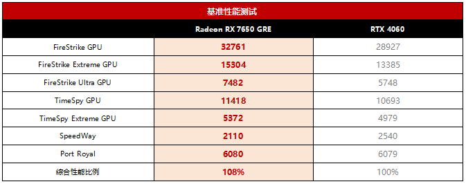 从基准性能测试情况来看,传统光栅化性能方面,RX 7650 GRE相对RTX 4060的优势是比较明显的,而在涉及DX12U与光追的Speedway与Port Royal项目中,两者也能打得有来有回。综合全部项目成绩来看,RX 7650 GRE平均领先RTX 4060的幅度大约为8%。当然,这只是理论性能的差异,在实际游戏中,还会涉及到具体的优化程度,情况还会有所不同。