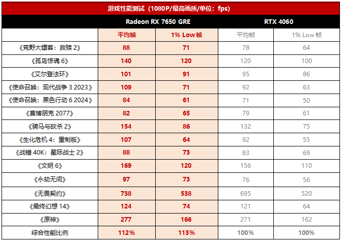 那么综合而言,在1080P游戏性能优势与价格优势的双重驱动下,可以说RX 7650 GRE的总体性价比优势较RTX 4060 达到了20%以上。