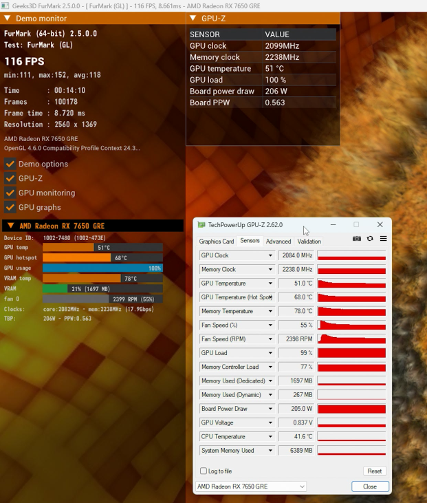 蓝宝石RX 7650 GRE黑钻版搭载3风扇3热管散热器,实测考机满载GPU温度仅有51℃,整板功率保持在205W水平,可以说性能释放和散热表现都是相当不错的。