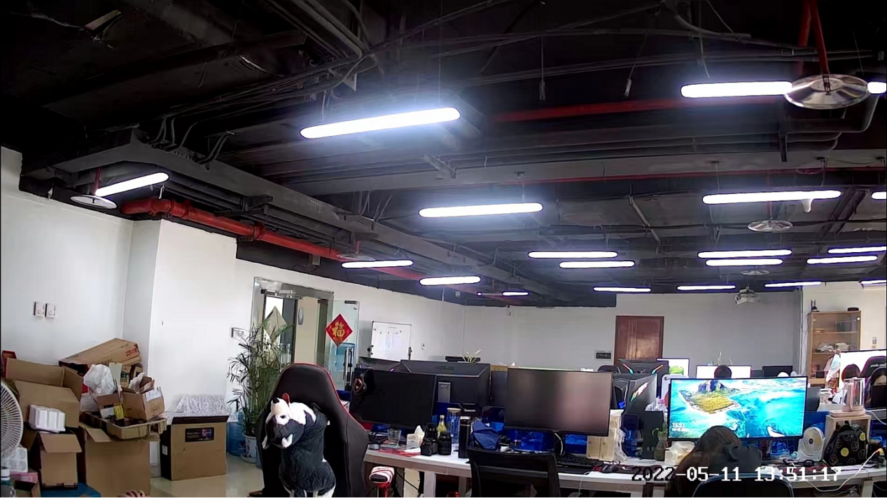 接着就是办公室环境,萤石CB2智能家居摄像机的表现同样可圈可点。画面纯净度很高,就算笔者仔细观察也没有发现明显的噪点。就算是顶部日光灯的高光部分,也只是稍微有些溢出。同时色彩还原也比较准确,画面远处门上的“福”字将其放大之后清晰可见。