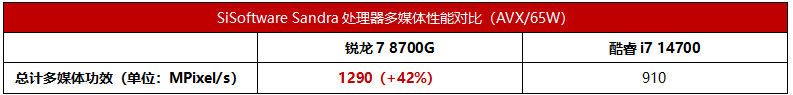 AVX512指令集可以大幅提升某些应用软件的执行效率,特别是在当下热门的AI应用中,AVX512的加速效果也是非常可观的。锐龙7 8700G就提供了对AVX512的支持,而第14代酷睿为了平衡功耗与发热,加之异构“大小核”设计中,CPU的效能核“小核”并不支持超线程和AVX512,因此整个CPU都砍掉了对AVX512的支持。可以看到,在SiSoftware Sandra支持AVX512的处理器多媒体运算测试中,锐龙7 8700G以8核16线程的规格就轻松击败了20核28线程的酷睿i7 14700,领先幅度高达42%。由此可见,如果企业用户要应对将来越来越普及的AI应用、或者进行AI应用开发测试,支持AVX512的锐龙7 8700G明显是更高效、适应性更好的选择。