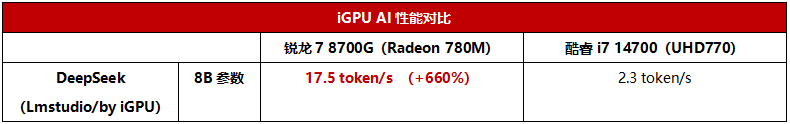 锐龙7 8700G具备强大的CPU+NPU+GPU三位一体的Ryzen AI技术,而在AMD的大力推动之下,目前已经有不少的AI应用提供了对它的专属支持,而这些工具无疑能给企业用户带来更高的办公效率。而即便是纯依靠GPU来计算的本地AI应用,锐龙7 8700G凭借内置的Radeon 780M也能提供比酷睿i7 14700内置UHD770高出660%的效率,完全不是一个维度的概念。