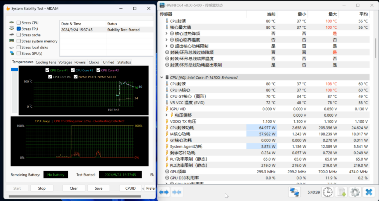 ▲酷睿i7 14700在65W持续满载状态下考机温度高达80℃,在205W爆发状态下甚至撞到100℃温度墙