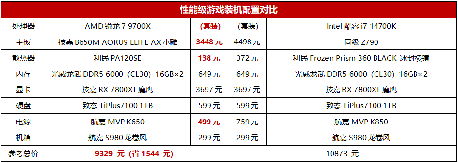 从前面的测试可以看到,锐龙7 9700X的8个全规格大核架构的游戏适应性更好,不会出现大小核调用影响游戏性能的问题,而且扩展性、功耗控制方面都相对酷睿i7 14700K有更好的表现。而实际游戏测试更是凸显了锐龙7 9700X的优势,在一些游戏中相对酷睿i7 14700K的帧率优势超过30%,部分游戏中也超过了10%,综合优势达到了13%,可以说领先了酷睿i7 14700K一个档次。实际的游戏功率方面,锐龙7 9700X比酷睿i7 14700K低了26%,100W左右的游戏功率使得玩家仅需一款百元风冷散热器即可压制,有效降低了散热器、主板和电源的装机预算。从我们的装机配置对比可以看到,锐龙7 9700X这套配置除了处理器之外,主板、电源、散热器也都相对酷睿i7 14700K那一套配置有着明显的价格优势,因此总价节约了1544元,而游戏性能却要高出一个档次,应该选谁相信游戏玩家心理已经有数了。