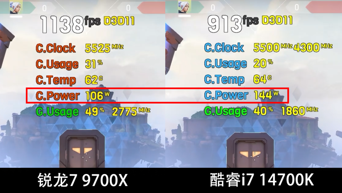 此外,在游戏功率方面,锐龙7 9700X也是完胜酷睿i7 14700K的。从游戏实时监测数据可以看到,《无畏契约》同场景下,锐龙7 9700X的功率为106W,而酷睿i7 14700K的功率则达到了144W,高出36%之多。而且值得注意的是,锐龙7 9700X除了默认的65W TDP功率设定之外,AMD还专门解锁了105W TDP模式,在这个模式下它的满载封装功率可达140W,远远超过游戏中的功率需求,因此可以在游戏中火力全开,而温度控制比完全解锁功率更出色。因此对于游戏玩家来讲,建议使用锐龙7 9700X的105W TDP模式,获取能效比黄金平衡的使用体验。