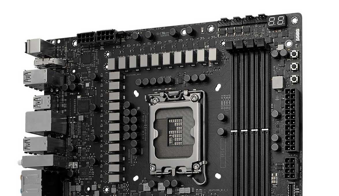 PCIe插槽方面,该主板搭载了两条PCIe5.0×16全长插槽和一条PCIe4.0×4插槽。两条PCIe5.0×16插槽可以分配为×16或×8+×8模式,非常灵活。为满足繁重的显卡负载需求,也为其提供 SafeSlot 固定支架的保护,并且顶部插槽可通过 Q-Release 显卡易拆键轻松释放,拆装显卡更方便。此外,PCIe插槽之间的间距非常广,可确保使用时不被其他设备遮挡,带来了更高的利用率。