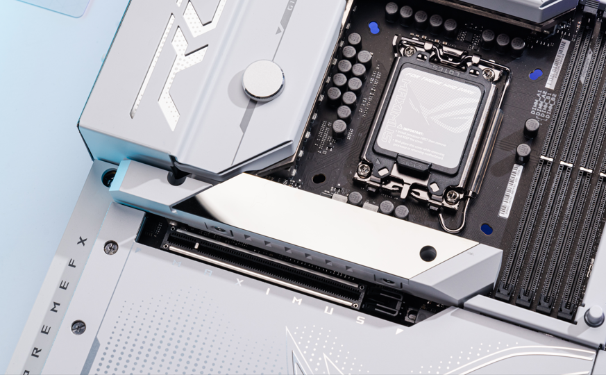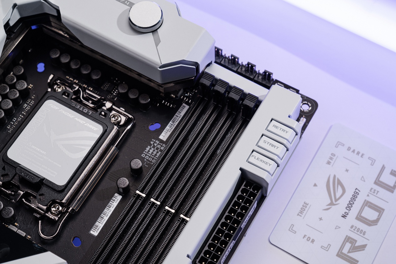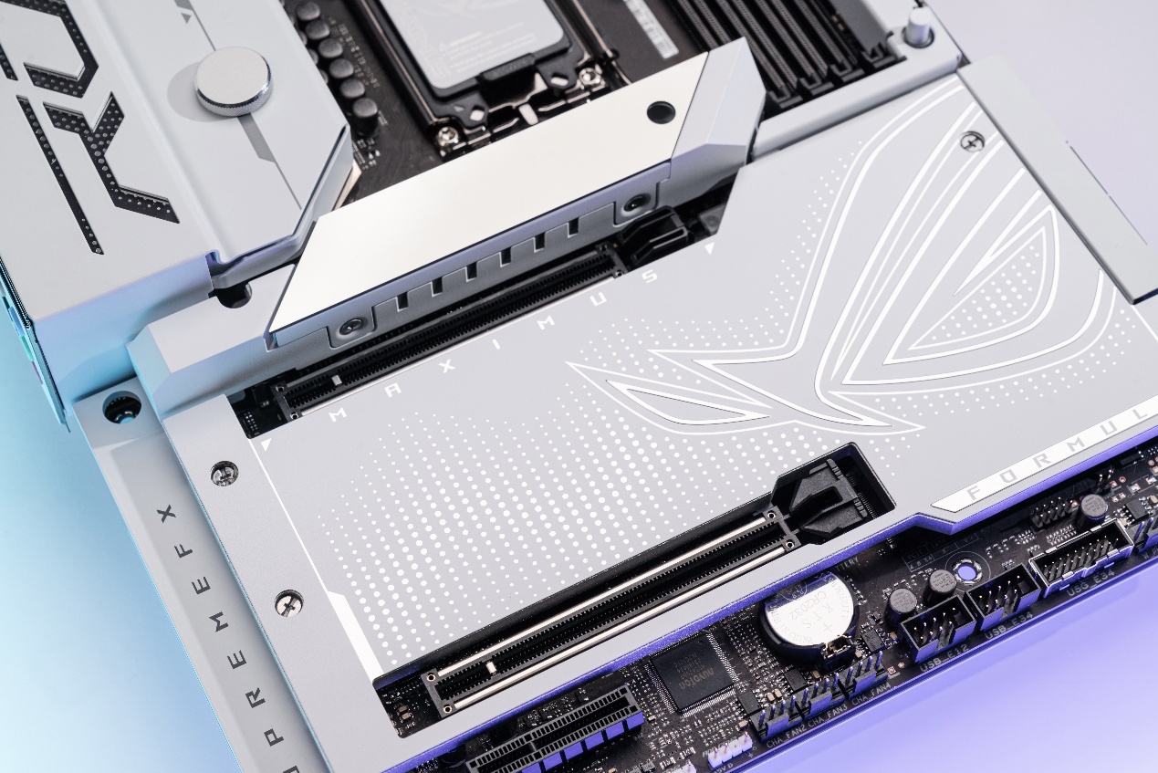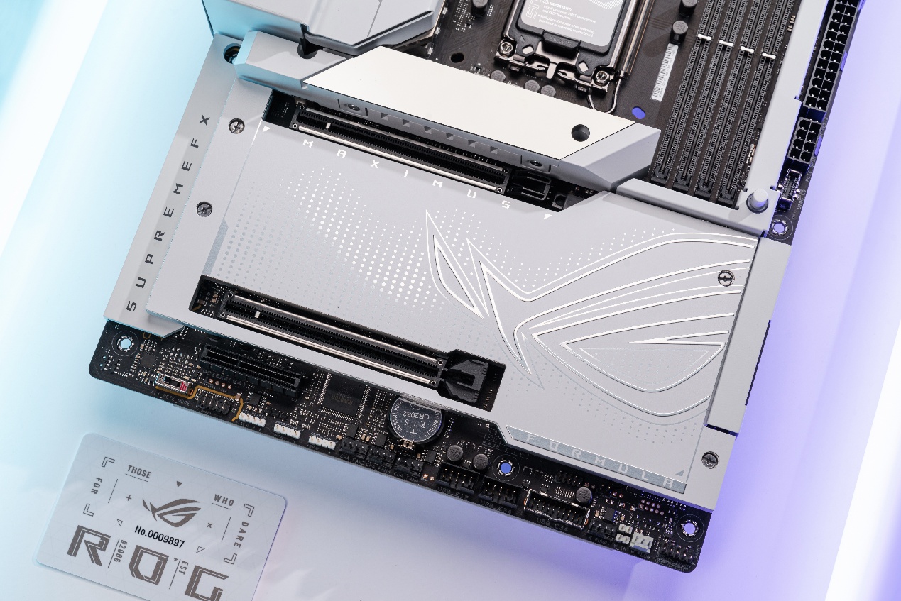 外观方面,这一代的ROG MAXIMUS Z790 FORMULA主板为玩家们带来全新的感受,它在保持家族式电竞潮牌的特征的前提下,将FORMULA系列特有的覆盖整个主板的散热装甲改为了月光白配色,带来了更加前卫时尚的外观表现。它也是高端主板中为数不多的采用白色配色的产品,PCH散热装甲上的矩阵式点缀,让其衬托下的“败家之眼”LOGO显得更加统一,银色与白色的搭配凸显出高级感与科幻感,将ROG独有的美学设计带入了新的层次,相信能得到不少打造白色主题高端DIY整机玩家的喜爱。
