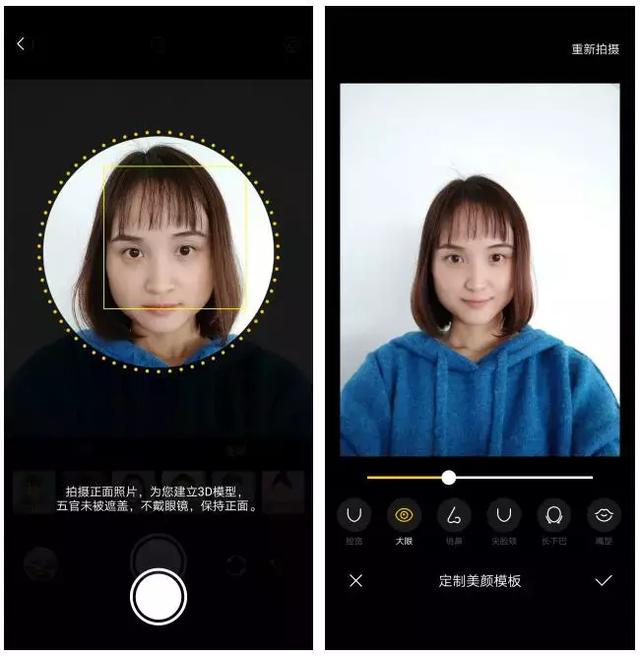 首先它会让你先自拍一张,定制一个属于自己的专属模板,有点类似现在有的3D游戏里的“捏脸”,操作非常简单,将脸颊、眼鼻、嘴型、下巴等各项调整到一个自己觉得最佳的状态。