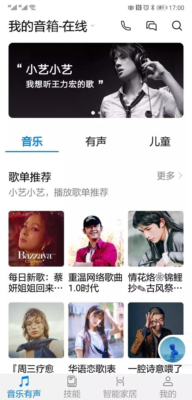 APP中的音乐有声页面提供了各种音乐、有声节目、儿童教育内容等,技能页面中可以看到各项功能