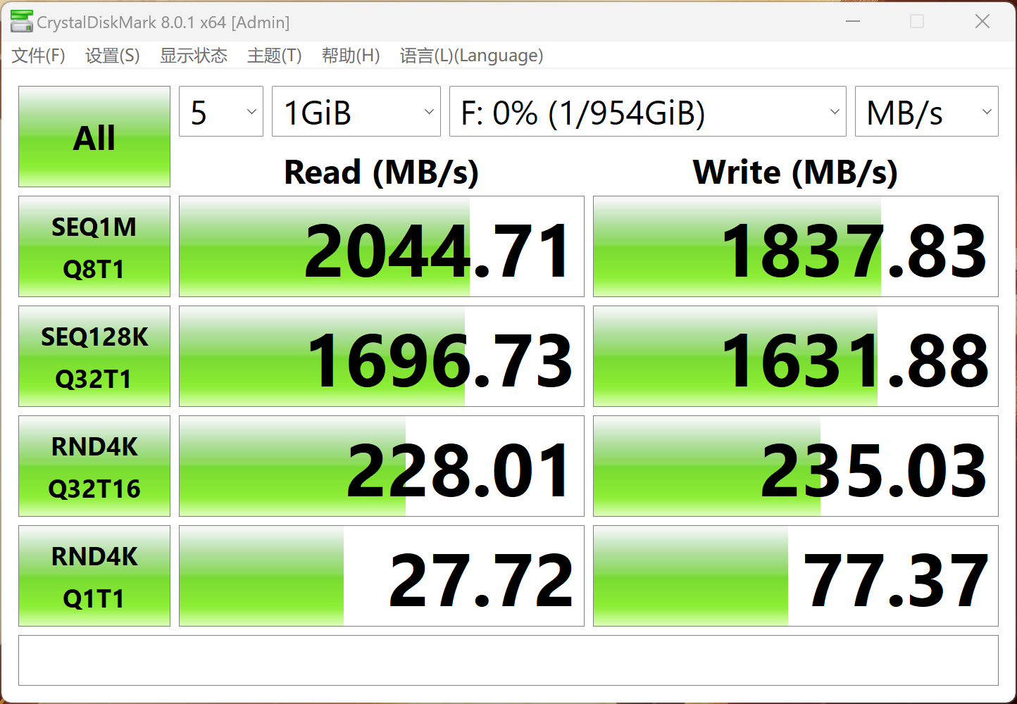 标称速度:读取2000MB/s,写入1800MB/s
