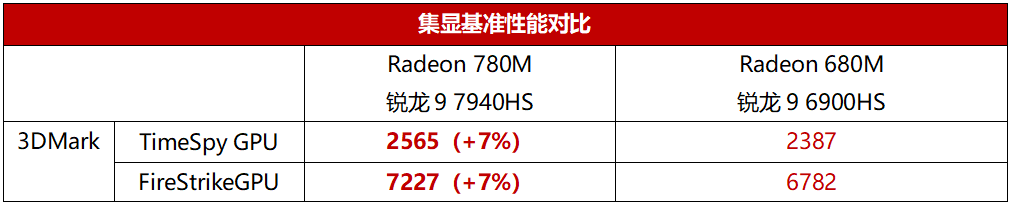 虽说灵刃14 2023已经搭载了RTX 4070独显,但不要忘了锐龙9 7940HS还内置了RDNA3架构的Radeon 780M核显,在需要极致续航的情况下玩游戏也很香。那么让我们来看看它实力如何。从3DMark基准测试得分来看,Radeon 780M相对上代的Radeon 680M提升幅度大约为7%,已经超越了GTX 1050 Ti和MX 570这样的入门独显,因此可以推断它应对电竞网游毫无压力,而在适当设置下玩3A游戏也是可以保证流畅的。