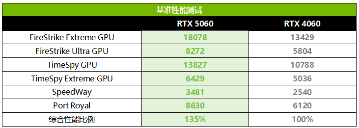 3DMark基准性能部分,可以看到,在DX11的FireStrike系列项目中,RTX 5060相对RTX 4060领先的幅度在35%~43%,4K分辨率下优势更大。在DX12的TimeSpy系列项目中,RTX 5060在2K和4K下都是领先RTX 4060大约28%。在DX12U和光追项目中,RTX 5060领先幅度大约为37%~41%,新一代光追单元和更高的显存带宽无疑带来了更多的优势。综合所有项目来看,RTX 5060相对RTX 4060的平均优势大约为35%,比较符合预期。