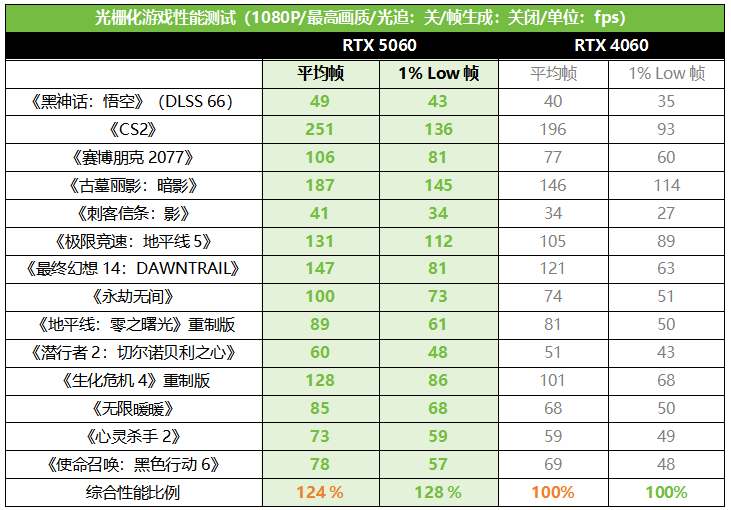 RTX 5060显然是定位1080P高帧率游戏体验,我们先来看看1080P下它的光栅游戏性能表现。我们这里测试了14款游戏,RTX 5060在《赛博朋克2077》《CS2》《永劫无间》《生化危机4》重制版中相对RTX 4060的提升尤其明显,平均帧分别领先了38%、28%、35%和27%,综合全部游戏来看,平均帧领先RTX 4060的幅度为24%。1% LOW帧部分,RTX 5060由于显存带宽比RTX 4060高出65%,所以也有更好的表现,综合全部游戏来看1% LOW帧平均领先RTX 4060的幅度为28%,可以说RTX 5060在流畅度方面的提升也是很明显的。此外,我们也可以看到,RTX 5060在1080P极限画质下,完全可以让绝大多数游戏大作都保持60fps甚至上百帧的流畅度,对于主流装机玩家来讲性能完全够用。
