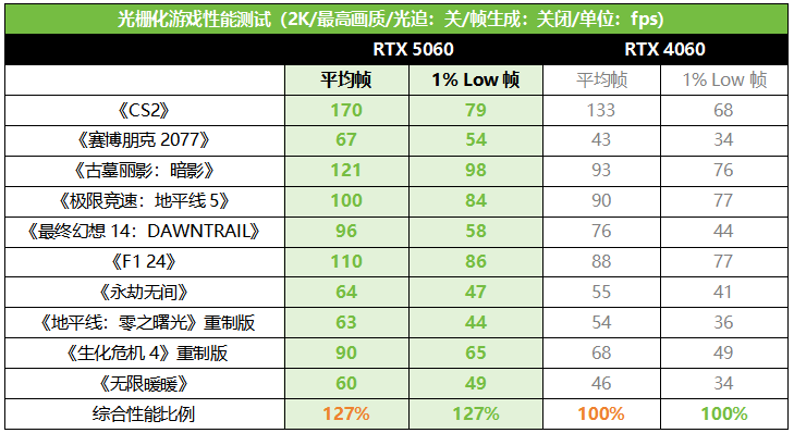 那么在2K分辨率下,RTX 5060表现又如何呢?从实测来看,即便是分辨率提升到2K,8GB显存的RTX 5060其实也是可以HOLD住大部分游戏大作的,同时更高的显存带宽也为它助力不少,平均帧和1% LOW帧相对RTX 4060的平均优势都达到了27%之多。