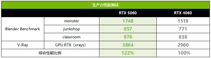 RTX 5060采用了效率更高的Blackwell架构,并拥有更多的CUDA数量、更先进的RT Cores、Tensor Cores,因此在3D设计方面的性能也是好于RTX 4060的。可以看到,在Blender Benchmark和V-Ray GPU RTX等3D渲染项目方面,RTX 5060领先RTX 4060的幅度大约在15%~31%,在涉及光追的V-Ray GPU RTX项目中领先幅度最高,达到31%,平均下来领先幅度为22%,优势非常明显。