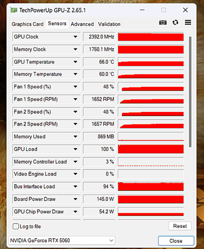 华硕DUAL-RTX5060-O8G满载考机,整卡功率达到公版的145W标准,环境温度27℃情况下,GPU最高66℃,显存最高60℃,可以说是非常凉快了。对于一款双风扇SFF-Ready的小卡来讲,这个散热效果可以说是相当出色的,非常适合追求冷静使用体验的小机箱用户。