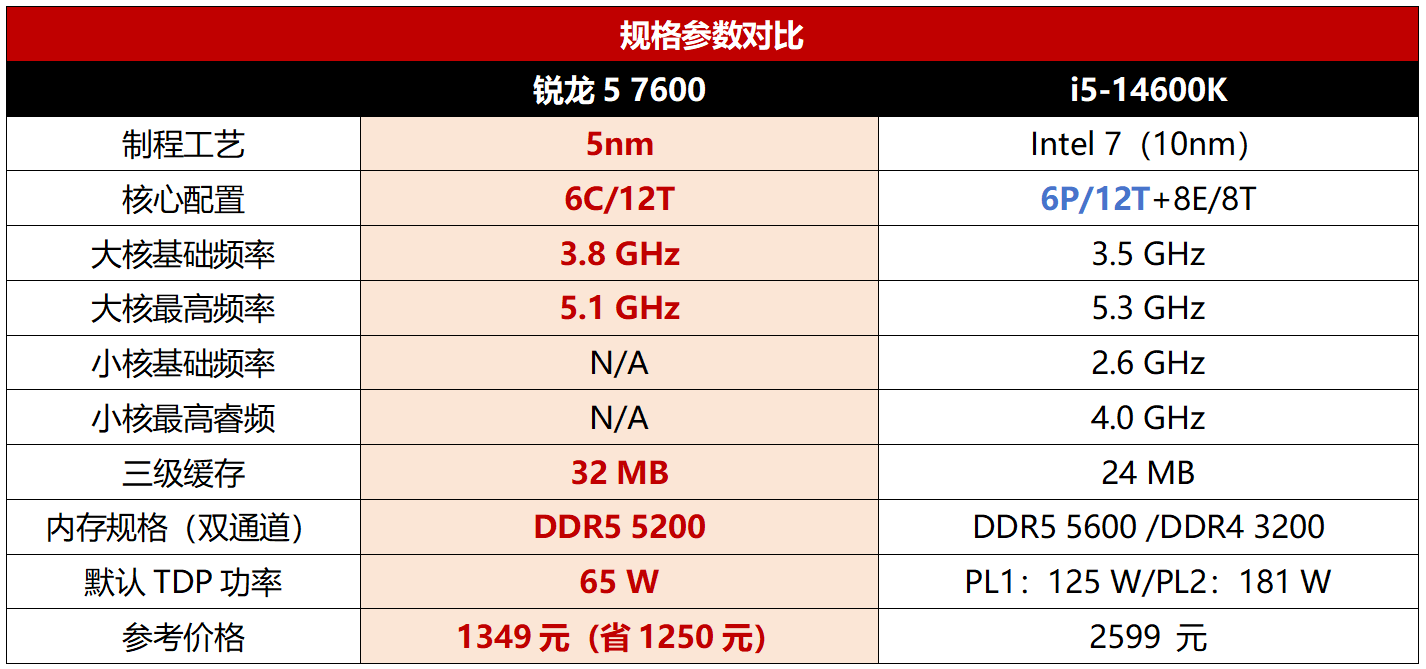 而且锐龙5 7600得益于优秀的能效比,发热控制得相当不错,直接使用自带的原装幽灵散热器即可满足散热的需求,不用额外购买散热器增加装机预算。而i5-14600K就不行,还得搭配比较强悍的散热器才能保证稳定的运行。