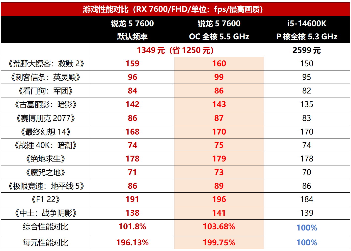 要是我们把价格因素加入进去,默频下的锐龙5 7600每元性能领先i5-14600K大约96.13%,全核5.5GHz的锐龙5 7600每元性能领先i5-14600K大约99.75%,都是接近翻倍的优势。