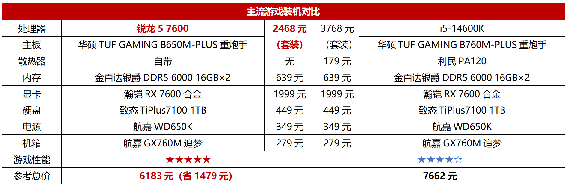 在主流玩家非常关注的价格方面,锐龙5 7600双十一促销价不过1349元。搭配一线品牌B650游戏主板,套装价更便宜。比如和华硕TUF GAMING B650M-PLUS重炮手的套装,价格为2468元,比单买便宜了180元,是不是性价比更高了呢?而i5-14600K单单是一颗处理器的售价就达到了2599元,要是再加上同档次的B760主板以及更高规格的散热器,那么锐龙5 7600平台的打造成本至少便宜1000多元,价格上的优势相当明显。