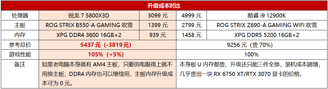 综合来看,锐龙7 5800X3D不但可以节约锐龙老玩家升级时购买主板和内存的预算,本身也堪称以“平民价格”提供顶级游戏性能,性价比无与伦比。酷睿i9 12900K升级只能三大件全换,本身价格也非常高昂,所以板U内存总价高出锐龙7 5800X3D平台70%之多,3800元出头的价差相信就算是预算充足的玩家也不会让它这样白白浪费掉。