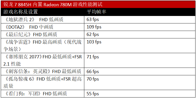 从测试来看,Radeon 780M的性能足以满足FHD分辨率下流畅运行3A游戏大作的需求,即便是《赛博朋克2077》《刺客信条:英灵殿》《孤岛惊魂6》等要求苛刻的游戏大作,平均帧率也能达到60fps以上,最近人气很高的ARPG《最后纪元》也能达到60fps左右,至于《DOTA2》《战争雷霆》这类电竞网游更是轻松超过100fps。